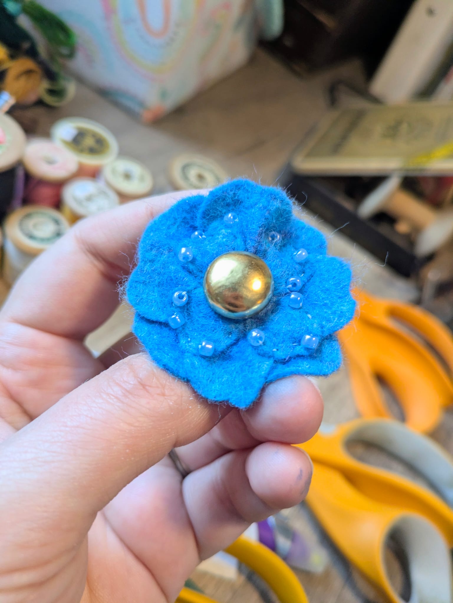 Dans l’Atelier, ça sent bon le café chaud et la laine. Pas de Mariah Carey en boucle (désolée Mariah, je t’aime, mais mes oreilles ont leurs limites), juste une playlist sympa et un clic-clac de ciseaux apaisant. Le soir, je retrouve des petits morceaux de fil paillettés partout — dans mes manches, dans mes cheveux, parfois même dans mon café. Mais j’adore ça ! Ces petites étincelles font partie de la magie des préparatifs de Noël.